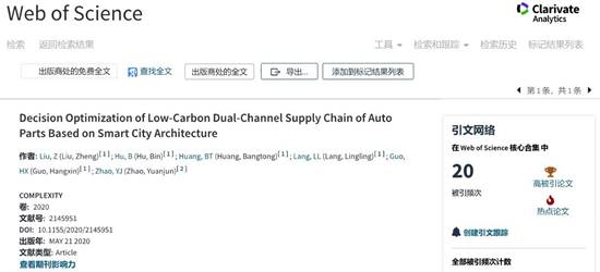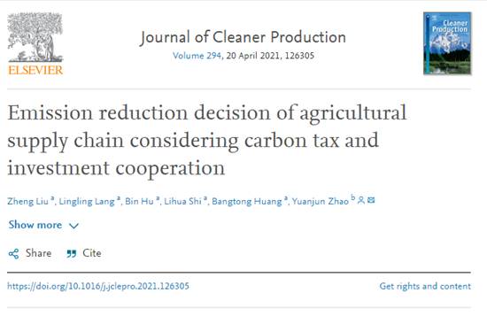 近期,伟德国际bevictor1946企业管理学科团队刘峥副教授、胡斌教授等教师在碳减排决策优化方面的最新研究成果合作论文“Emission reduction decision of agricultural supply chain considering carbon tax and investment cooperation”发表于环境科学与生态学、数学跨学科应用领域的高水平期刊《JOURNAL OF CLEANER PRODUCTION》,该期刊系中科院SSCI/SCI一区Top期刊,影响因子为7.2;合作论文“Decision optimization of low carbon dual-channel supply chain of auto parts based on smart city architecture”发表于高水平期刊《COMPLEXITY》,入选ESI(Essential Science Indicators)热点论文和高被引论文,科研成果得到同行认可。