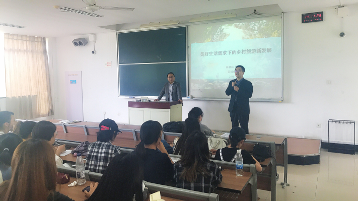 林博士在讲座开始后首先为同学们介绍了自己的求学经历以及工作经历。他选择旅游行业的初衷是想要快乐地工作,他也期望同学们都可以从工作中获取快乐,从而更加有动力的工作。随后,林博士从“旅游业发展的新时代”这个主题出发,介绍了中国旅游业近年来的发展新趋势。随着中国经济的发展和人民生活水平的改善,旅游对于老百姓来讲已不再是多年前的一种奢侈的娱乐方式,而逐渐成为了一种大众化的消费方式。人民群众对于旅游的需求不仅量在增加,质也在增长。而近年来随着人们消费心理的变化,乡村旅游成为了当下旅游市场的风口,越来越多的城市消费者会在节假日选择去游览乡村风景而不是都市风光。但在这样的趋势下,乡村旅游也同样面临着挑战。不少乡村旅游景区面临着产品同质化、产品单一化的问题,而这些问题不可忽视,只有从消费者的角度出发,深入研究消费心理与消费行为,才能设计出真正让消费者满意的优质旅游产品,推动旅游产业的长足进步与不断发展。