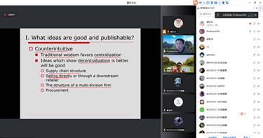 本次线上讲座Chunming Shi博士系统地介绍了如何在学术期刊上撰写科研论文,并以学术论文“The Benefit of Horizontal Decentralization in Durable Good Procurement”为例,将文中重要观点和学术价值进行了梳理。在讲座的最后,师生们与Shi教授围绕写作论文的范式,如何选择合适的期刊等问题展开了充分的讨论和交流,老师们表示此次讲座对学术研究提供了参考。
