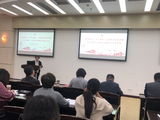 周洁书记以“从严治党,发挥党支部战斗堡垒作用”为题,做了“不忘初心、牢记使命”主题教育专题党课。周洁书记首先讲到对初心使命的感悟。她强调作为第二批主题教育,要更加突出理论学习、更加突出问题导向、更加突出激发群众参与热情、更加突出发挥党支部作用,她讲到要在学习党史、新中国史、新思想中感悟初心和使命,初心和使命要求我们要坚定理想信念,践行党的宗旨,初心和使命要求我们要勇担历史使命,为党育人,为国育才。其次对习近平总书记关于教育的重要论述的学习体会。周洁书记从加强党对教育事业全面领导的根本要求、立德树人的根本任务、坚持社会主义办学方向的政治原则、服务中华民族伟大复兴的使命担当、加强教师队伍建设的基础作用等方面阐述了对习近平总书记关于教育的重要论述的深刻理解,再次讲到思想上、工作上、作风上存在的差距。周洁书记从党性修养上、学习实效上和推动工作上三个方面检视了存在的问题。最后是加强和改进的思路措施,对照检视问题,周洁书记提出了四条整改措施。一是强化党支部政治功能,全面提升新时代教工支部的发展水平。二是强化培训学习,全面提升工作能力,实现“干什么学什么、缺什么补什么”。三是强化创新思维,全面提升管理水平。四是强化服务意识,全面服务师生发展。