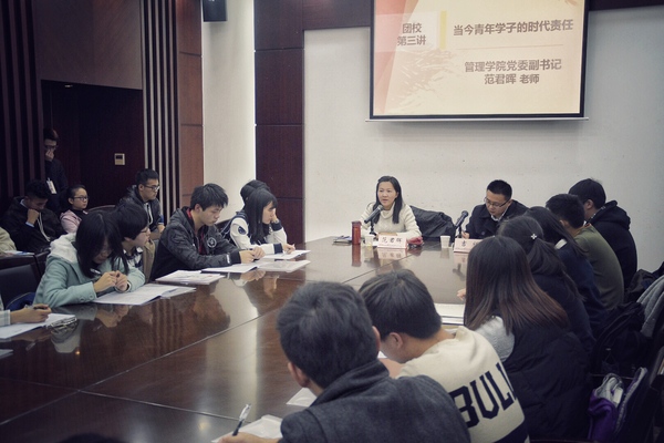 团课伊始,范老师从“当今”一词破题,通过时间维度和空间维度将大家的思绪引向远古、外太空,生动诠释了“当今”的含义,并结合计算机网络技术发展鼓励同学们认真学习,勇于承担时代的责任。引用习近平总书记的“强国富民”一词,范老师对青年一代应尽的责任作了概括。她说:“当代青年应当认识到中国未来发展主要依靠于青年们的激情和努力,共同孕育出具有核心竞争力的先进科技,以此来促进社会发展,增强国家软实力。”